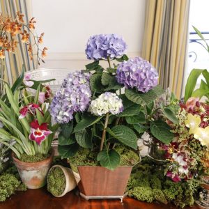 hortênsias em vaso de prata