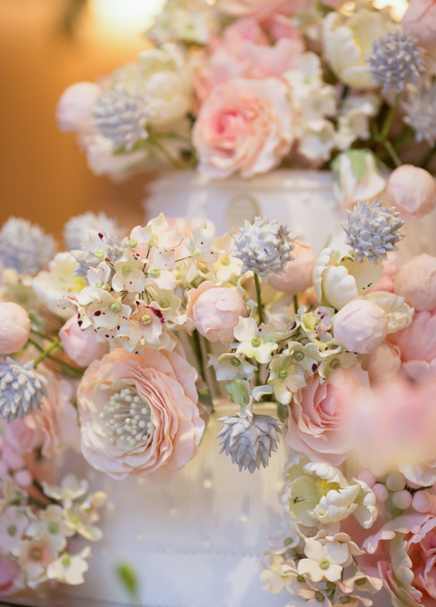 Fizemos uma composição com arranjos únicos de mini rosas, hortênsias, tulipa branca, rosa creme e bouvardia, uma flor rara da família das camélias, linda, e que se encontra pouco nas floriculturas. Para amarrar, dois arranjos iguais com flores misturadas, entre peônias, angélica, cravinho, mini rosas, rosas, hortênsias e tulipas, com base de folhas de eucalipto.