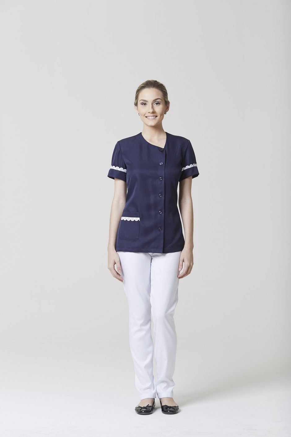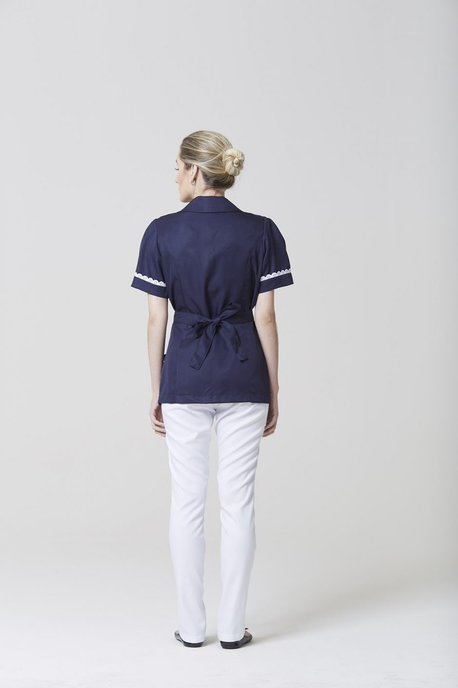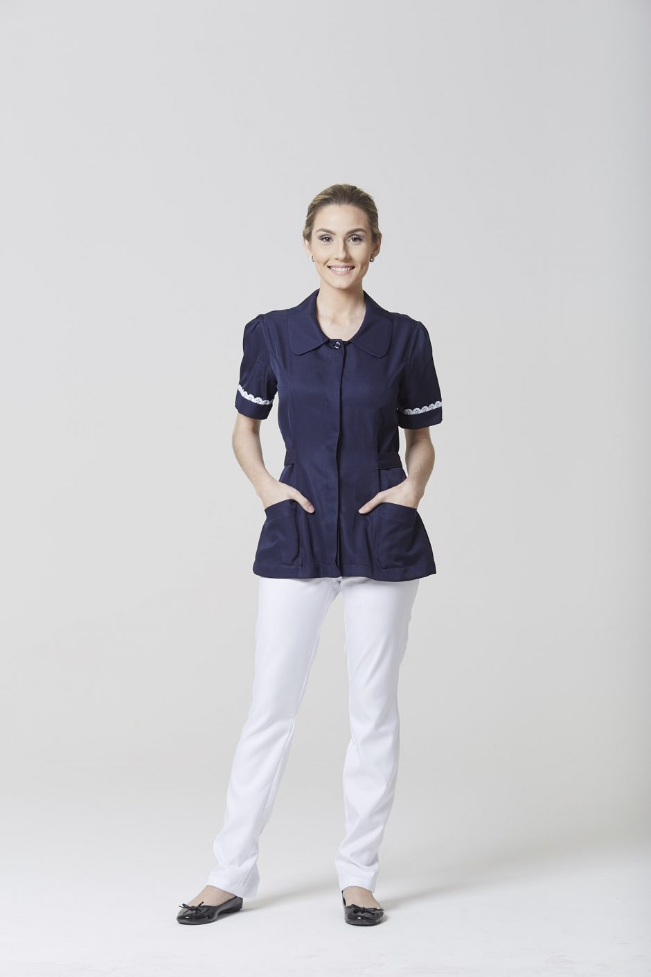 Entre os jalecos, há várias opções de modelos, cada um com um diferencial de design. O jaleco Isis tem bolso tipo faca, vindo da alfaiataria masculina, golas redondas e amarração que deixa o modelo acinturado e um leve arredondado no quadril muito elegante. Já o jaleco para serviços gerais  e o jaleco feminino babados brincam com a assimetria, tanto no abotoamento deslocado quanto na gola em formato de gota (também assimétrica, formada pelo abotoamento), passando pelo bolso único, só de um lado das peças.