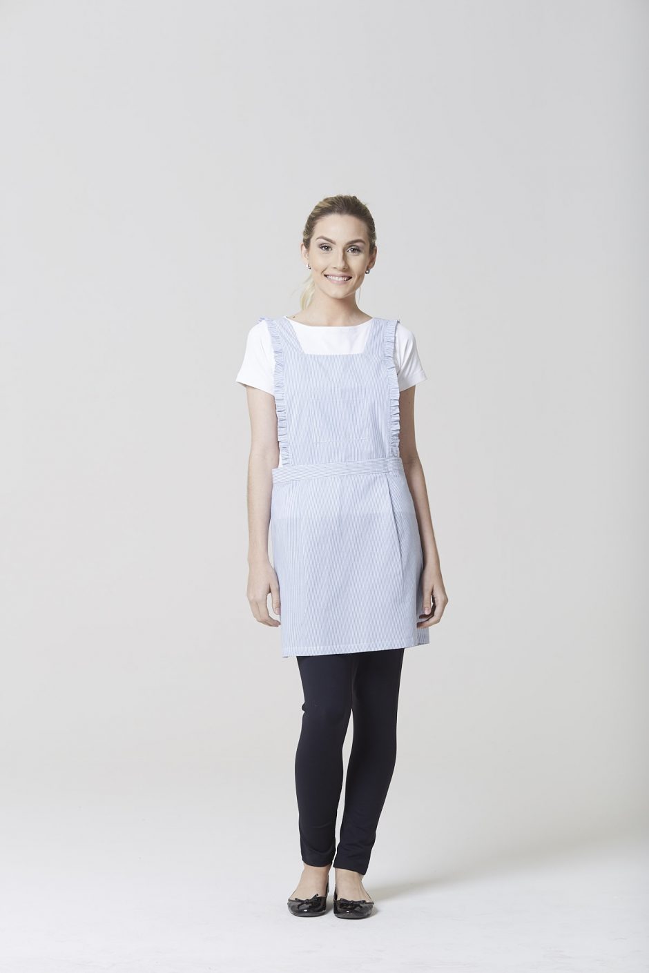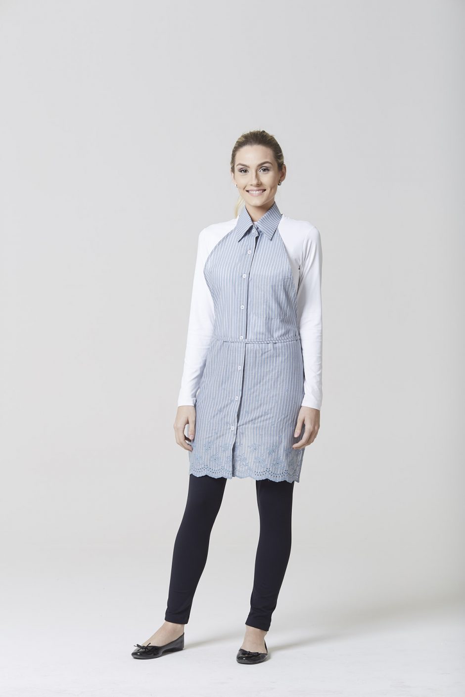 Um bom exemplo desse mix de moda e funcionalidade são os vestidos Isabella e Valentina. Ideais para o serviço em eventos como jantares e almoços com convidados e festas noturnas, eles têm um comprimento confortável, mangas com ombro mais estruturado, que podem ser curtas (Isabella) ou longas (Valentina) e base de camisaria na parte de cima, com o avental acoplado fazendo uma releitura do peplum, o babado abaixo da cintura típico da alta-costura parisiense. Olhando de costas, o babado forma anquinhas, outra referência à moda de luxo, detalhe que é um primor de design!